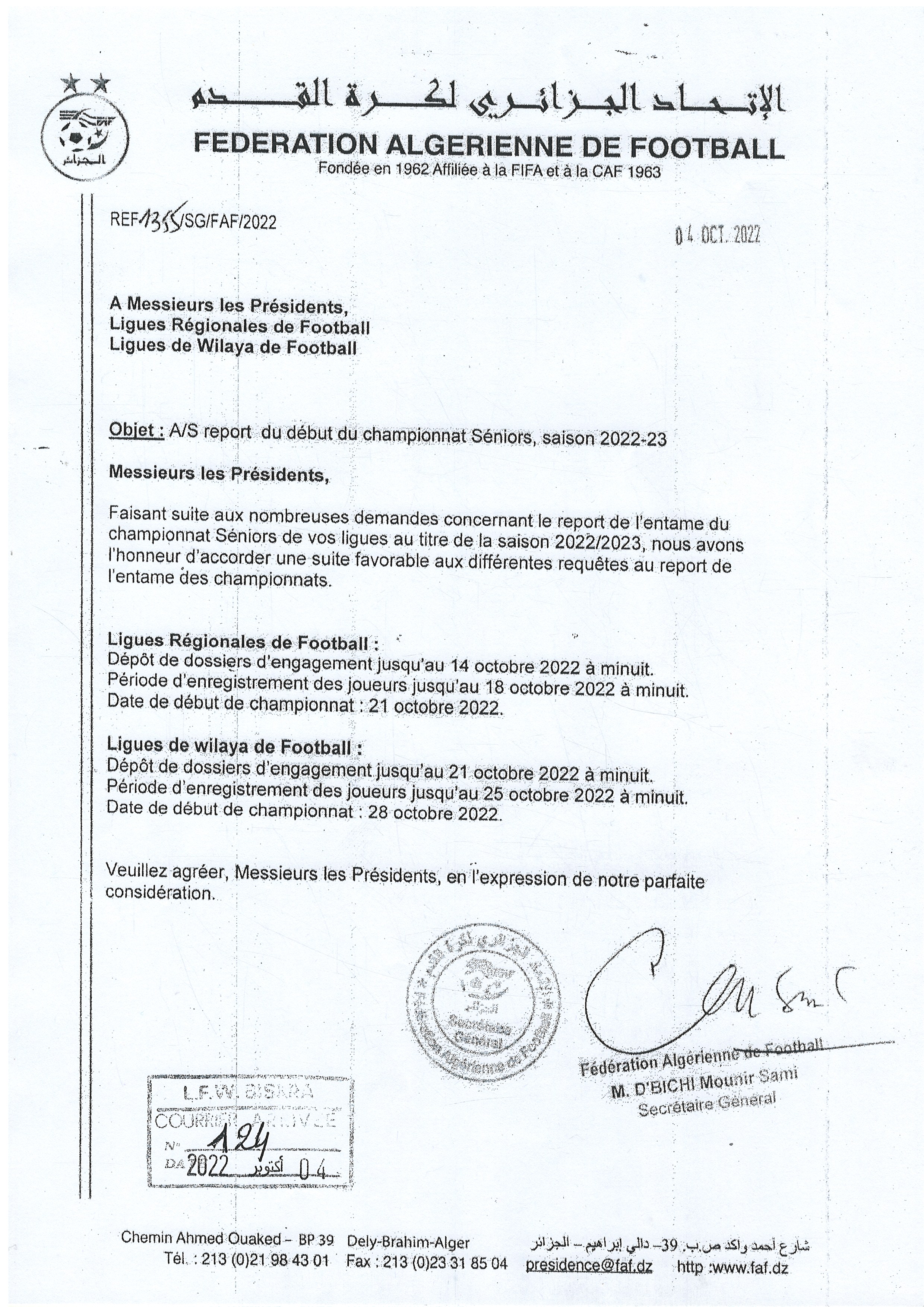 تبعا لمراسلة الاتحاد الجزائري لكرة القدم والمتعلقة بتمديد الآجال والتي جاءت على النحو التالي :