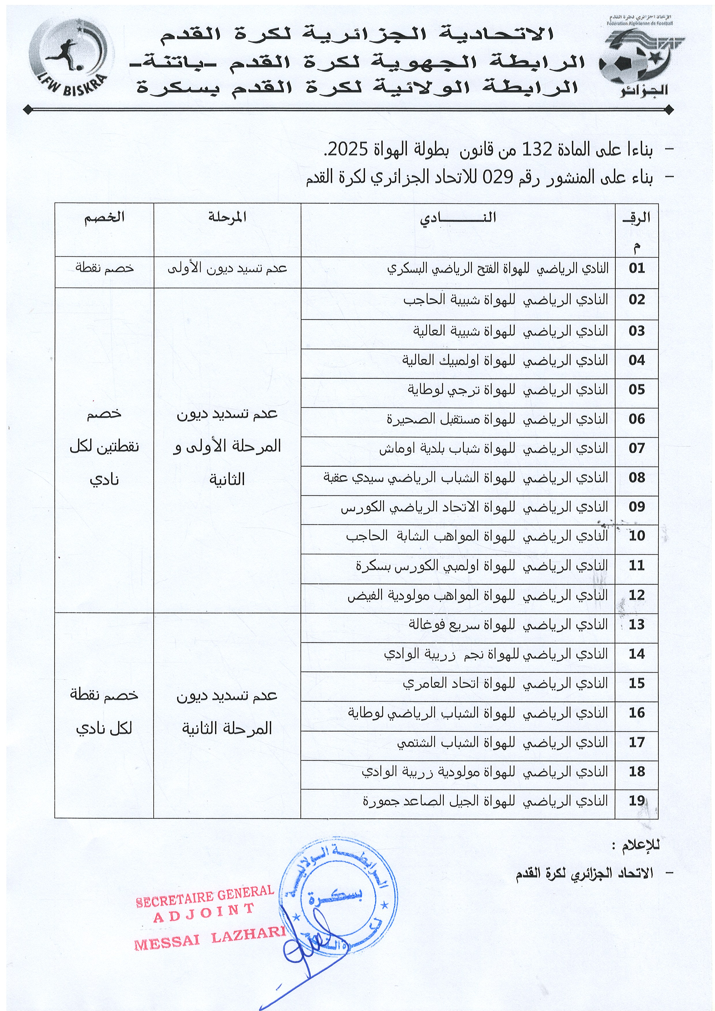 Tous droits réservés © 2016 - 2026 Ligue Wilaya de Football - Biskra.
