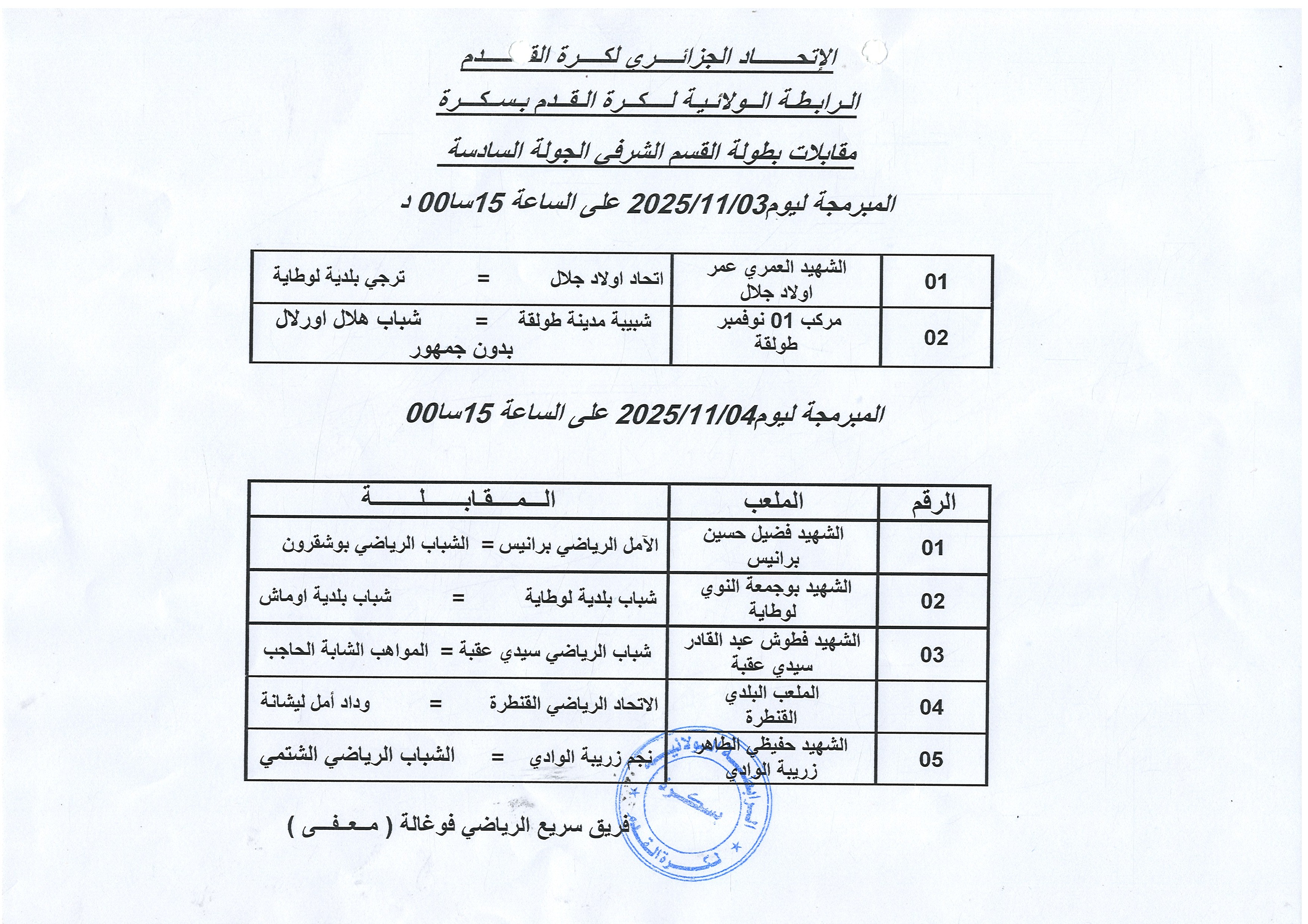برنامج مقابلات القسم الشرفي الجولة السادسة ليوم الثلاثاء 04 نوفمبر 2025